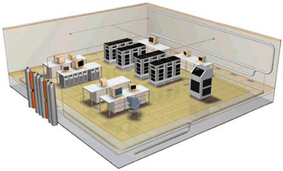 distintos racks que albergan a los servidores, cabinas de almacenamiento,